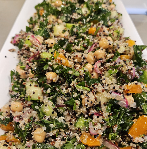 Nutrient-dense quinoa and kale salad available by the tray for gatherings, meal prep, or catering. This wholesome blend combines protein-rich quino...
