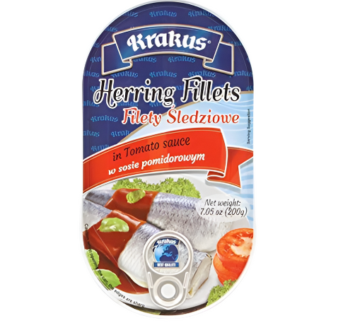 FILETY SLEDZIOWE W SOSIE POMIDOROWYM, HERRING FILLETS IN TOMATO SAUCE, KRAKUS,7.05 OZ
