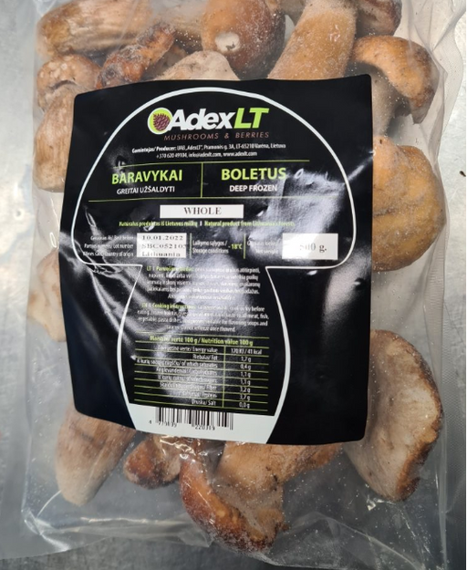 Frozen boletus whole Ingredients: Boletus Country of origin: Lithuania Net quantity (g/ml): 500 g Brand: ADEX