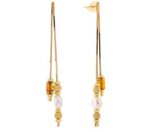 Long hanging gold plated 925 silver earrings with pearls and cognac Baltic amber