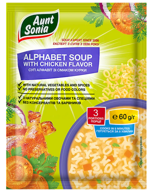 View full detailsAUNT SONIA Chicken flavor Dry Soup with Alphabet Pasta